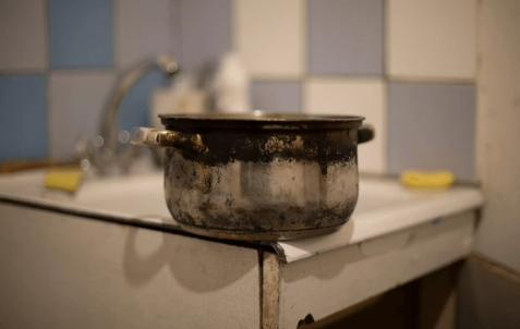 냄비 바닥이 까맣게 타버린 상황.